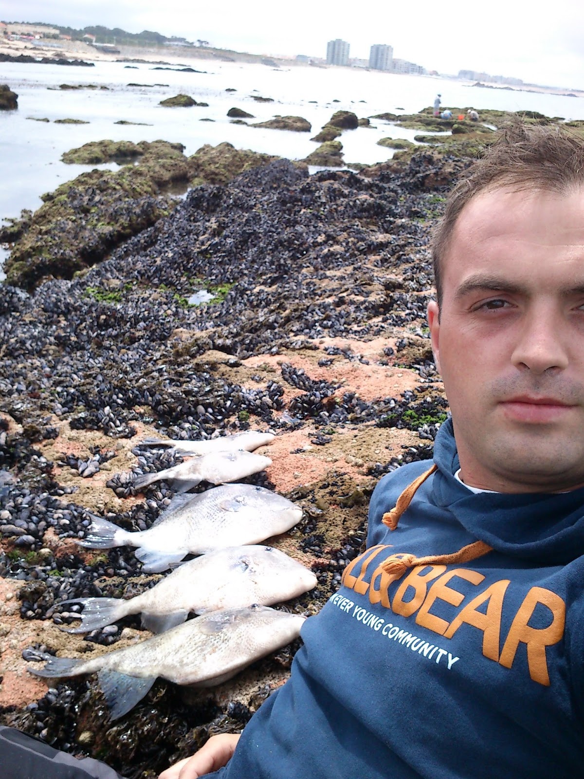 "Depois de mais uma tentativa falhada aos sargos, vim a casa tomar o pequeno almoço e fui ver se apanhava um polvo para o jantar mas também sem sucesso, mais tarde dei com os peixes porcos a passear quase em seco, com uma linha de mão com mexilhão e sem chumbeira la safei a grade, sim pk o 1º peixe porco que apanhei levou-me a única chumbeira que eu tinha na mochila e tambem não me quis dar ao trabalho de amarrar um calhau.... hahahahamais tarde apanhei esse mesmo peixe que me tinha fugido mais a frente amarrado aos ouriços com a seda e com a chumbeira que me levou...LOOL "